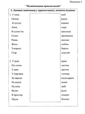 У доповненому тексті учні знаходять іменники з прикметниками, ставлять питання до прикметників, визначають їх закінчення, роблять висновки про змінювання прикметників.