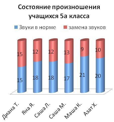Диана Т., 12 лет; в норме 15 звуков, замена или нечеткое произношение 15 звуков.