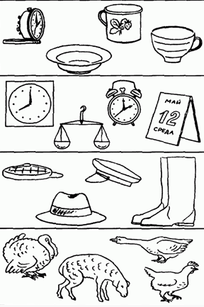 | 10 баллов | – ребенок решил поставленную перед ним задачу за время, меньшее, чем 1 мин, назвав лишние предметы на всех картинках и правильно объяснив, почему они являются лишними. |