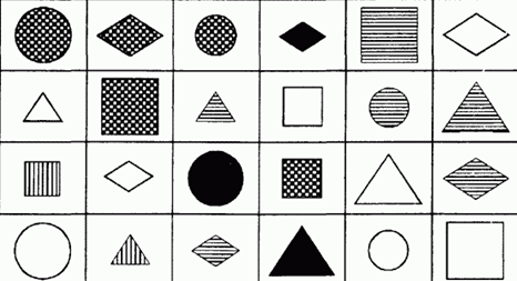 | 10 баллов | – ребенок выделил все группы фигур за время меньшее чем 2 мин. Эти группы фигур следующие треугольники, круги, квадраты, ромбы, красные фигуры (на рис они черного цвета), синие фигуры (заштрихованы в линейку), желтые фигуры (в клеточку), большие фигуры, малые фигуры |