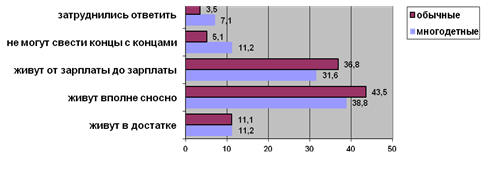 4)С точки зрения экономики: многодетная семья – это та, где предельная экономическая полезность каждого нового ребенка ниже придельных затрат на него, иначе говоря, рождение каждого нового ребенка ухудшает положение семьи и ее членов. Так, в Российской Федерации в 1993 году среди семей с одним ребенком бедных было 33%, с двумя детьми – 45%, с тремя и более – 61%. В конце 1994 года ниже уровня бедности жило 38% семей с одним ребенком, 57% семей с двумя детьми и около 77% семей с тремя детьми. С экономической точки зрения, если такая тенденция сохранится, многодетными могут считаться и семьи с двумя детьми.[]