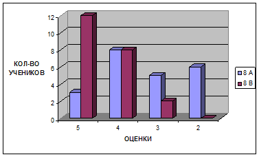 Для констатации результата после проведения разработанных занятий были проведены контрольные работы, состоящие из тестов, которые приведены в главе III. Результаты эксперимента в школе приведены на диаграмме, отражающей изменения качества знаний и успеваемости в контрольном (8 а) и экспериментальном (8 в) классах.