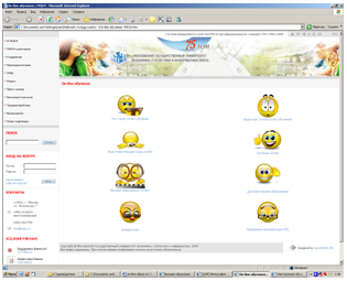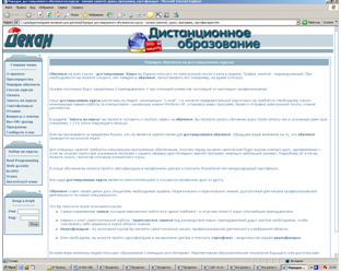 Обучение происходит следующим образом: студент регистрируется и знакомится с системой обучения и системой оплаты за обучение на главной странице, и он автоматически присоединяется к списку уже в данный момент зарегистрированных студентов. Он заходит на рубрику «задания» и скачивает себе на компьютер информацию, выполняет, задание и потом по e-mailотправляет преподавателю, возможно даже с вопросами, вопросы можно будет задавать с помощью программы ICQ, по выполнению заданий и их сдаче, он будет ориентироваться, по расписанию. На сайте он сможет задавать вопросы преподавателю как в of-lineрежиме, так и в on-lineрежиме на сайте много интересных рубрик, где он найдёт много интересной для себя информации: фотографии студентов, фотографии о конкурсах, фотографии преподавателей, информацию о факультете, о специальностях, новости и будет себя чувствовать как студент, который учиться в реальном университете.