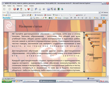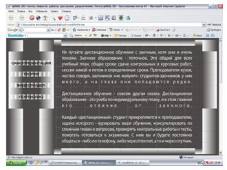 Дистанционное образование - это система учебных программ, разрабо-танных профессионалами, для доступа к которым необходим выход в Интернет. Вы включаете компьютер, открываете сайт вуза или образовательного центра, набираете логин и пароль и приступаете к виртуальным занятиям, а затем по электронной почте получаете домашние задания.