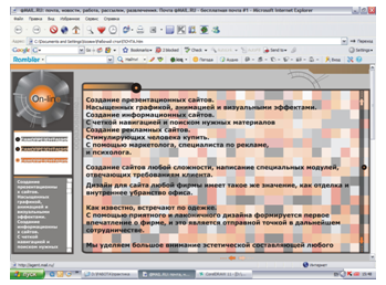 Конечный вариант сайта разработанный из поисковых вариантов притягивающий своим ярким и красочным дизайном. Так же интересной деталью является, расположение на шапке сайта изображения красивых девушек которые являются студентками технологического факультета по специальности «реклама», и даже некоторые из них являются помощниками разработки дизайна сайта. Дизайн выполнен в оранжевом цвете, оранжевый цвет выбрали потому что он является основным в цветовой гамме рекламного агентства студентов «образ» технологического факультета а так же на мой взгляд является отображением современной молодёжи (студентов и школьников).