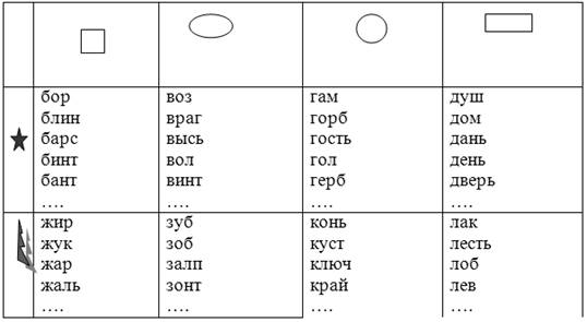 Таблица (приложение Ж) может использоваться учителем в самом начале обучения чтению. Работа по ней ведётся также как по предыдущим. Таблицу можно предложить детям раскрасить, тем самым усложнить работу над ней. Раскрашивание таблицы будет способствовать развитию мелкой моторики руки.
