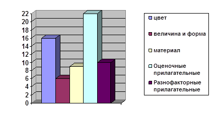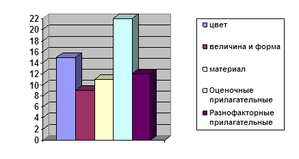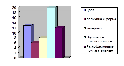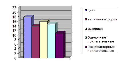 У детей существенно изменилось соотношение групп прилагательных. Видно, что больше всего прилагательных цвета, затем прилагательных, обозначающих материал, и примерно столько же оценочных прилагательных и прилагательных величины и формы, разнофакторных прилагательных – 11 слов