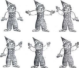 Аналогічне завдання діти можуть виконувати з опорою на малюнки із зображенням відповідних рухів — «фотографії» з виступу веселого клоуна.