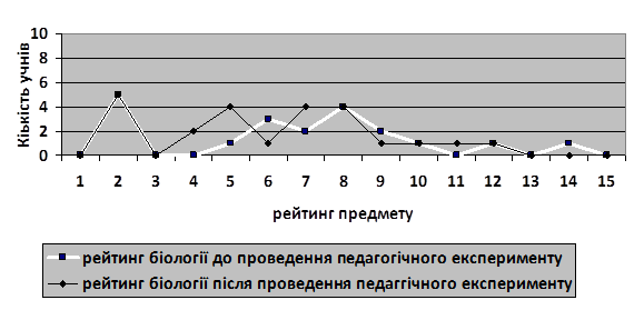 Наведемо зведений графік зміни рейтингу предмета шкільної біології після проведення нами педагогічного експерименту (рис.3):