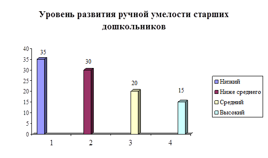 На основании графических показателей нами было выявлено, что у 20% детей задание выполнено качественно почти идеально, у 35% дошкольников работы имеют небольшие погрешности, а у 45% испытуемых качество работ осталось ниже среднего и низкого уровня.