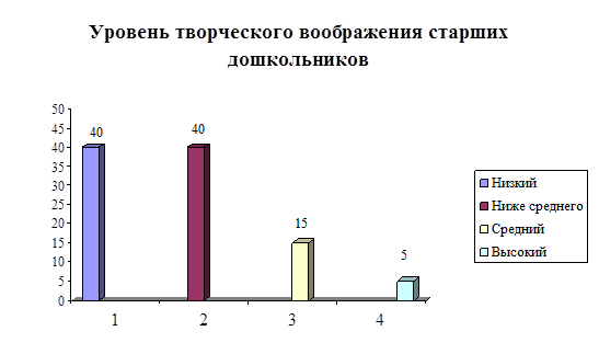 Итак, анализ графических данных показал, что уменьшилось количество детей бездумно повторяющих образец, увеличилось количество детей, которые научились придумывать свой образ, что говорит о повышении уровня творческого воображения у детей старшего дошкольного возраста.