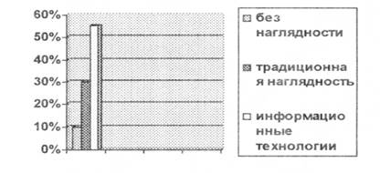 Часто учебники или другие печатные пособия имеют ссылку на исторические памятники, изображение которых в них отсутствуют. Проводить урок по теме "Культура" не имеет смысла, если перед глазами учащихся не имеются зрительные образы. Усвоение материала в данном случае будет иметь очень низкий процент (10%). Урок с использованием традиционных наглядных средств обучения значительно повышает этот процент (30%). При применении на таких уроках мультимедийных программ наблюдается значительный рост усвоения материала, чем при применении традиционных наглядных средств обучения. (>50%).