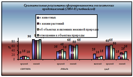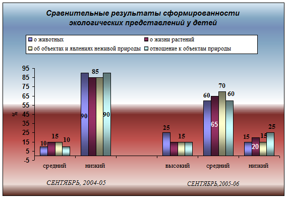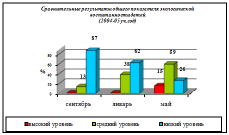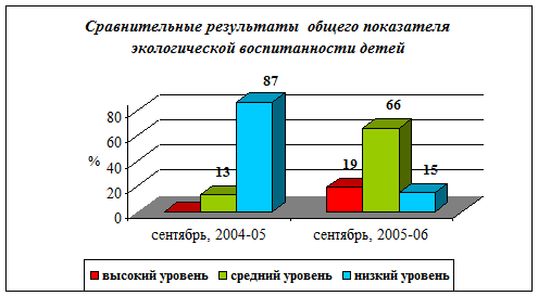 Анализ сравнительных результатов общего показателя экологической воспитанности детей выделенной группы выявил положительную динамику в его формировании за период с СЕНТЯБРЯ 2004-05 уч.года по СЕНТЯБРЬ 2005-06 уч.года. Так, экологическая воспитанность выросла до высокого уровня, который составляет 19%, значительные качественные изменения претерпел показатель среднего уровня , он вырос с 13% до 66% соответственно, а показатель низкого уровня экологической воспитанности снизился до отметки 15% (для сравнения: в СЕНТЯБРЕ 2004-05 уч.года составлял 87%).
