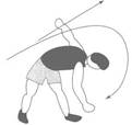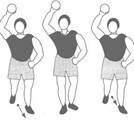Далі завдання ускладнюються: нахилити тулуб вперед і зробити той самий рух двома руками. Потім, поволі піднімаючи тулуб, повторювати рух ("двері відчиняються — зачиняються") (мал. 1). Повторюючи рух, слабшу руку поступово опустити, щоб прийти до імітації метання сильнішою рукою вперед з одночасним рухом слабшої руки низом назад. Пояснити залежність успішності кидка від різкості руху: чим швидший рух руки назад, тим сильніше метаєш вперед [12].