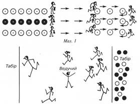 4. Рухлива гра "Попади в ціль". Клас поділити на чотири команди — дві команди дівчаток і дві команди хлопчиків (див. мал. 3). Кожна команда шикується в колону по одному за загальною лінією для метань.