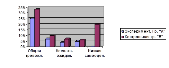 | Общая тревожность в школе | Страх самовыражения | Страх несоответствия ожиданиям окружающих | Низкая физиологическая сопротивляемость стрессу | Низкая самооценка качеств личности | |