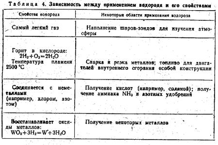 Объясняя применение водорода, учитель должен показать, как связано оно со свойствами простого вещества и его соединений. При этом важно подчеркнуть ценность водорода как химического сырья и как перспективного элемента для энергетики будущего. Водород—экологически чистое топливо, так как, сгорая, он образует воду— вещество, не чуждое природе (табл. 4).