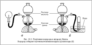 Вместо цинка можно использовать железо, алюминий и некоторые другие металлы, а вместо серной кислоты – некоторые другие разбавленные кислоты. Образующийся водород собирают в пробирку методом вытеснения воды (см. рис. 10.2 б) или просто в перевернутую колбу (рис. 10.2 а).