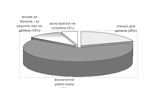 3. Проблема оцінки не втратила своєї гостроти для всіх учасників навчального процесу: учителів, учнів і їхніх батьків, причому для останніх навіть в більшій мірі. При цьому роль і значущість оцінок для вчителів полягає в одержанні зворотного зв’язку про ефективність навчання, що є підставою для визначення потенційних можливостей учня; для учнів – в об’єктивності оцінки своїх навчальних досягнень, у формуванні самооцінки й рівня домагань; для батьків – у оцінці здібностей своїх дітей і власних зусиль щодо їх виховання.