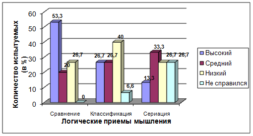 · уменьшилось количество детей с низким уровнем сформированности логических приемов: сравнения (на контрольном этапе исследования не выявлено детей с низким уровнем сформированности логического приема сравнения; классификации с 40 % до 13,3 %; сериации - с 26,7 до 20 %;