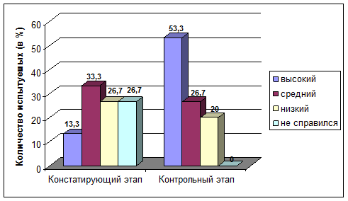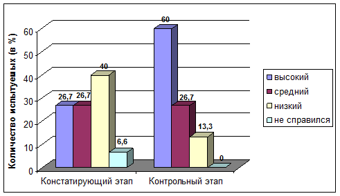 Не выявлено на контрольном этапе исследования ни одного ребенка, который бы не справился с заданием, а таких на начало работы было 4 ребенка (26,7%).