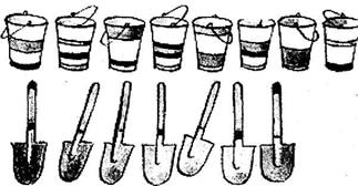 Сколько ведер? А лопат? Чего больше? На сколько?