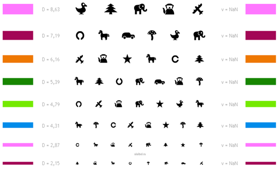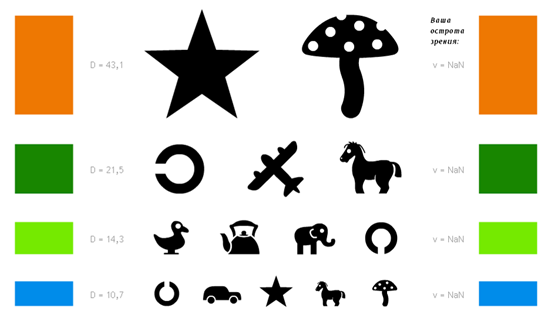 Як оптотипи використовують букви, цифри, малюнки і тому подібне Сучасні таблиці як для дітей, так і для дорослих побудовані по десятковій системі. У кожному ряду розміри оптотипів однакові, але поступово зменшуються від першого ряду до останнього. Таблиці розраховані на дослідження гостроти зору з 5 м. На цій відстані деталі оптотипів десятого ряду видно і відповідають гостроті зору, рівній одиниці. Якщо гострота зору інша, то визначають, в якому ряду таблиці обстежуваний розрізняє знаки. При цьому гостроту зору обчислюють за формулою Снеллена [78]: ![]()