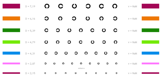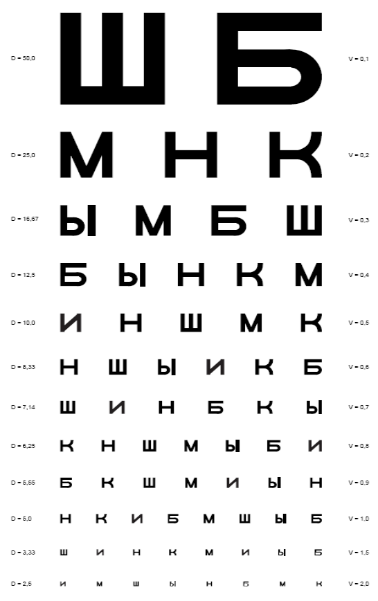 D - відстань, з якої око розрізняє знаки цього ряду (проставлено в кожному ряду зліва від оптотипів).