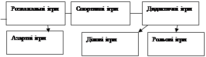 Ураховуючи досвід класифікації дидактичних ігор та власні міркування щодо досліджуваної проблеми, ми дійшли висновку, що чинне поняття “дидактична гра” можна розширити, виділивши з нього групу ігор, які готують до комунікативної діяльності (ігри, спрямовані на формування мовної компетенції), та ігри, що забезпечують комунікативну діяльність (сприяють формуванню мовленнєвої, соціокультурної та загальнонавчальної компетенцій учнів початкової школи). Таку диференціацію можна зобразити у вигляді схеми.