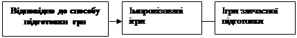 Як ілюструє схема, у навчанні іноземної мови доцільно керуватися принципом наступності, тобто поступового переходу від ігор, спрямованих на формування мовних навичок, до ігор, які власне забезпечують формування і подальший розвиток механізмів мовлення. Тобто, розглядати навчально-ігрову діяльність як засіб формування та удосконалення знань, умінь і навичок під час навчання іноземної мови.