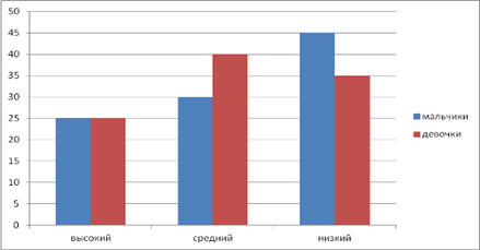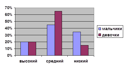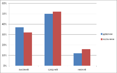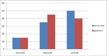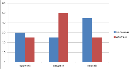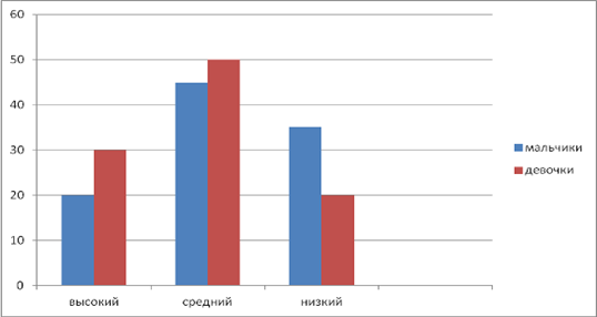 Таким образом, в целом в группе испытуемых преобладает средний уровень интеллекта. При этом % мальчиков и девочек с высоким уровнем интеллекта имеет одинаковое значение, и составляет 20%. Средний уровень интеллекта показали 65% девочек и 45% мальчиков, Низкий – 35% мальчиков и 15% девочек.