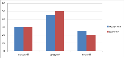 Из рисунка 3 мы видим, что одинаковое количество мальчиков и девочек показали высокий уровень развития долговременной памяти (30%). Процент девочек со средним уровнем развития долговременной памяти (50%) немного превысил процент мальчиков (45%). Низкие результаты в группе мальчиков показали 25% испытуемых, тогда как среди девочек этот процент составил 20%.