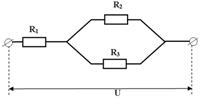 10. Для схеми на малюнку відомі опори резисторів R1 = 20 Ом, R2 = 40 Ом, R3 = 30 Ом та сила струму, яка проходить крізь перший резистор, і дорівнює 0,5 А. Визначити напругу джерела струму та спільну силу струму в колі. |