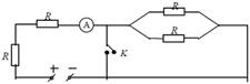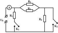 На схемі, зображеній на малюнку, ключ К розімкнутий. На скільки зміниться показання амперметру після замикання ключа, якщо на кінцях кола підтримується постійна напруга 50 В. Опори усіх резисторів однакові і дорівнюють 5 Ом.