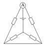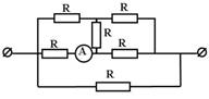 Амперметр зображений на малюнку показує 2 А. Опори всіх резисторів однакові і дорівнюють 10 Ом. Вважаючи дроти ідеальними, знайти струм короткого замикання. ЕРС джерела 12 В.