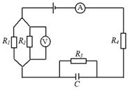 В колі, зображеному на малюнку, вольтметр показує 10 В, а амперметр 1 А. Конденсатор ємністю 3 нф має заряд 60 нКл. На скільки зміняться показники вольтметру, якщо трапиться пробій конденсатору? ЕРС джерела 40 В, його внутрішній пір 1 Ом (R1
