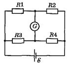 13. На малюнку ξ = 2 В, R1 = 60 Ом, R2 = 40 Ом, R3 = R4 = 20 Ом та RG = 100 Ом. Визначити силу струму, яка проходить крізь гальванометр.