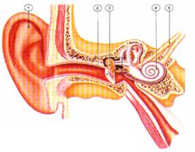 1-наружное ухо;2-среднее ухо;3-барабанная перепонка;4-внутреннее ухо, лабиринт