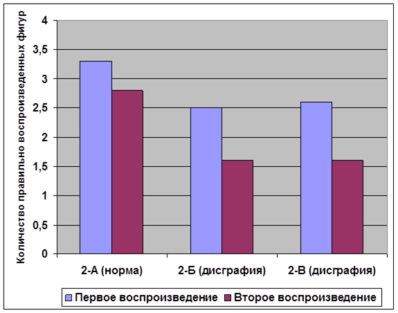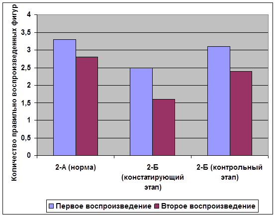 Результаты детей экспериментальной группы значительно улучшились и приблизились к показателям детей с развитием письменной речи в норме. Так, среднее количество правильно воспроизведенных фигур у второклассников экспериментальной группы во время первого этапа диагностики составило 3,1 фигуры (у второклассников с развитием письменной речи в норме — 3,3 фигуры), а среднее количество правильно воспроизведенных фигур во время второго этапа диагностики составило 2,4 фигуры (у второклассников с развитием письменной речи в норме — 2,8 фигуры).