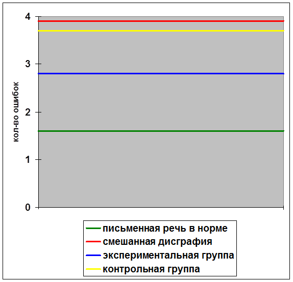 Сравнительный анализ письменных работ под диктовку и списывания показал, что в среднем в одной письменной работе учеников экспериментальной группы обнаружено 2,8 ошибок, а в одной письменной работе учеников контрольной группы в среднем обнаружено 3,7 специфических ошибок. Несмотря на то, что качество выполнения письменных работ детьми экспериментальной группы не приблизилось к уровню работ детей с развитием письменной речи в норме (1,6 ошибок), оно значительно повысилось по сравнению с данными констатирующего этапа (3,9 ошибок).