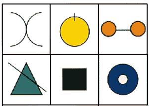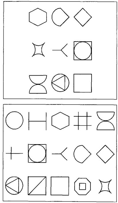 2. Запомни фигуры на верхнем рисунке, затем закрой его листком бумаги и попробуй по памяти найти их на нижнем рисунке.