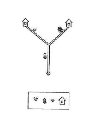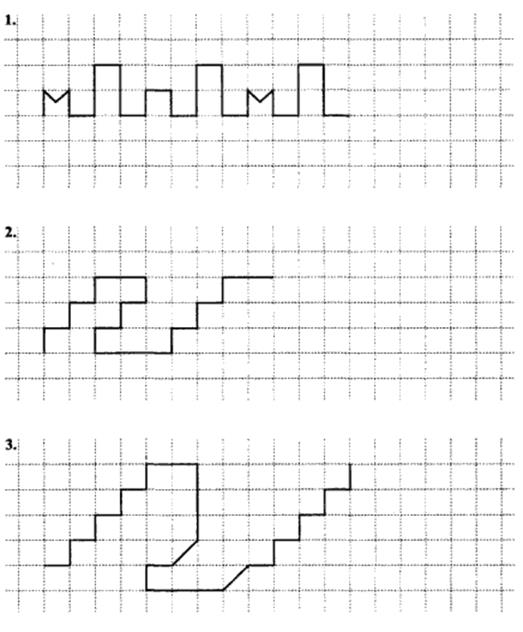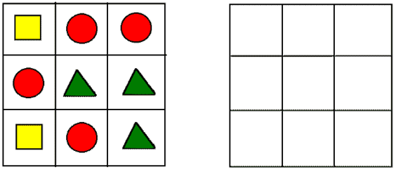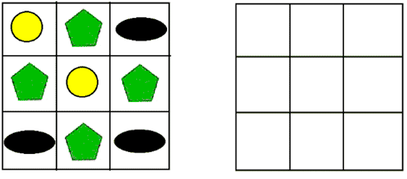 1. Запомни расположение фигур, а затем вычерти их по памяти в пустом квадрате.