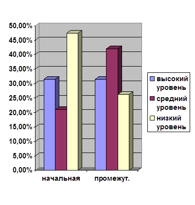 Исходя из того, что проблема формирования двигательной активности детей актуальна. Нами была проведена диагностика физического развития у детей 1 младшей группы по методике Лагуткиной Л.Н. (приложение 1). Диагностика показала , что основные движения детей развиты недостаточно, высокий уровень имеют 31,6% детей, средний - 21%, низкий – 47,4%.