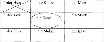 а) Вчитель показує картинку, учні називають українською, що це. Далі вчитель перевертає картинку, на звороті написано (різним кольорами, за принципом "кольорового" навчання) це слово німецькою, та приклади речень з ним. Вчитель пояснює читання даних слів. Учні вже ознайомлені на попередніх уроках з принципами "кольорового" читання.