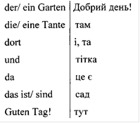 а) Вчитель показує картинки, учні називають зображене слово українською, вчитель перевертає картку. На звороті написане дане слово німецькою. Учні записують слова в словнички. Читають слова за вчителем.