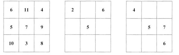 Магічні, або цікаві, квадрати Це квадрати, які складаються з 9, 16, 25 кліток. У клітках мають бути записані такі числа, сума яких у всіх напрямах (рядках, стовпчиках і діагоналях) однакова. В одному випадку всі числа задані -квадрат заповнений (див. перший квадрат). Треба перевірити, чи є квадрат магічним. У другому випадку в квадраті не всі числа задані, але названо суму (див. другий квадрат). Треба заповнити квадрат. У третьому випадку і числа не всі задані і суму не названо, треба ще знайти цю суму і після цього заповнити квадрат (див. третій квадрат).