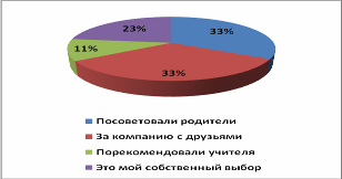 Данные диаграммы показывают, что при выборе Тарногского ПУ - 49 большое количество детей прислушиваются к совету родителей. Значит дальнейшее образование является важным не только для самих детей, но и их родителей. Также выбор - это за компанию с друзьями – это, конечно, не осознанный выбор, но плюс в том, что ребята смогут быстро приспособиться к новым условиям. Некоторые учащиеся говорят, что это их собственный выбор, и лишь малая часть поступает в это учебное заведение по рекомендации учителей.