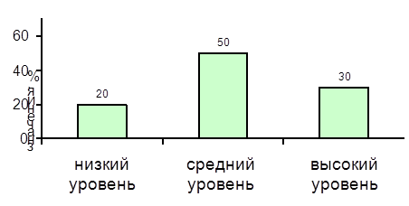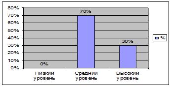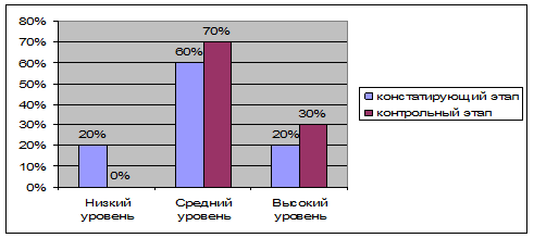 Сравнение данных констатирующего этапа с данными, полученными на контрольном этапе показывает, что количество детей с высоким уровнем конфликтности уменьшилось до 0, на 10% увеличилось количество детей, имевших средний уровень конфликтности. За счет уменьшения количества высокого уровня конфликтности на 10% увеличилось количество детей, показавших низкий уровень конфликтности. В целом, это доказывает, что содержание и приемы формирующего этапа эксперимента были выбраны правильно и оказались эффективными для снижения уровня конфликтности у детей.