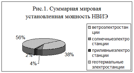 Основой энергетики сегодняшнего дня являются топливные запасы угля, нефти и газа, а также энергия рек, запасы которых составляют около 5% всех запасов энергии на Земле. И, тем не менее, они удовлетворяют примерно девяносто процентов энергетических потребностей человечества.Подсчитано, что при сегодняшнем уровне потребления энергии, даже без учета его роста, ископаемых источников энергии хватит еще максимум на 100 - 150 лет. В этот расчет не входят альтернативные источники энергии, такие как энергия ветра, морских приливов, тепла Земли, солнечного излучения и некоторые другие. Практически все направления альтернативной энергетики, значительно менее опасны в экологическом отношении, чем в традиционном.В настоящее время суммарная мировая установленная мощность геотермальных электростанций составляет более 6 тыс. МВт, ветроэлектростанций более 4 тыс. МВт, солнечных более 400 МВт, приливных более 250 МВт. (Рис.1)