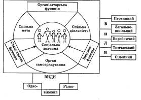 У шкільному колективі, який є формальним утворенням, функціонують різноманітні самодіяльні групи (неформальні дитячі об'єднання), діяльність яких спрямована на реалізацію та розвиток інтересів і потреб їх учасників [64, 314]. Формальна група — група, структура і діяльність якої раціонально організовані та стандартизовані згідно з точно приписаними груповими правилами, цілями і ролевими функціями. Ефективність функціонування її забезпечується системою керівництва та контролю. Безпосереднє управління спирається на владні повноваження, розподілені відповідно до формально-статусної структури групи. Неформальна група — самодіяльне об'єднання громадян, статус, структура, функції якого юридично не оформлені. Отже, якщо формальні групи, будучи створеними для певної соціальної діяльності, мають юридично визначений статус, нормативну базу існування, яка закріплює структуру, тип завдань, колективні та індивідуальні права й обов'язки, то неформальні такої регламентації позбавлені.